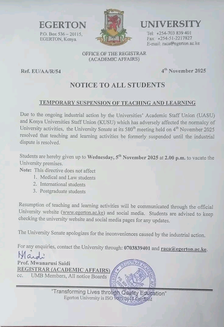 Egerton University has announced the suspension of all teaching and learning activities following the ongoing industrial action by the Universities’ Academic Staff Union (UASU) and the Kenya Universities Staff Union (KUSU), which has disrupted normal operations.