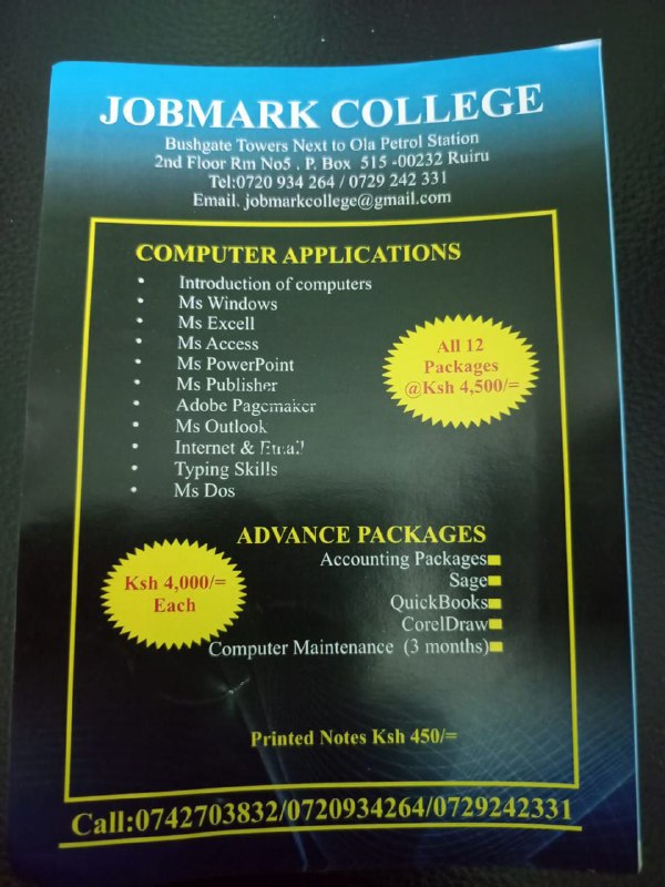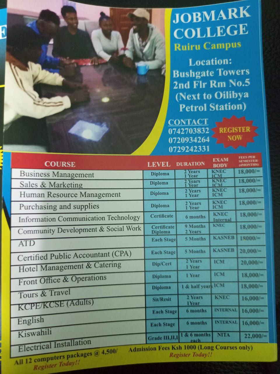 Jobmark College is a professional training institution situated in the heart of Ruiru, Kenya. It is located on the second floor of Bushgate Towers, Room No. 5, right next to the Ola Petrol Station. This central and accessible location makes it ideal for commuting students from Ruiru and surrounding areas.